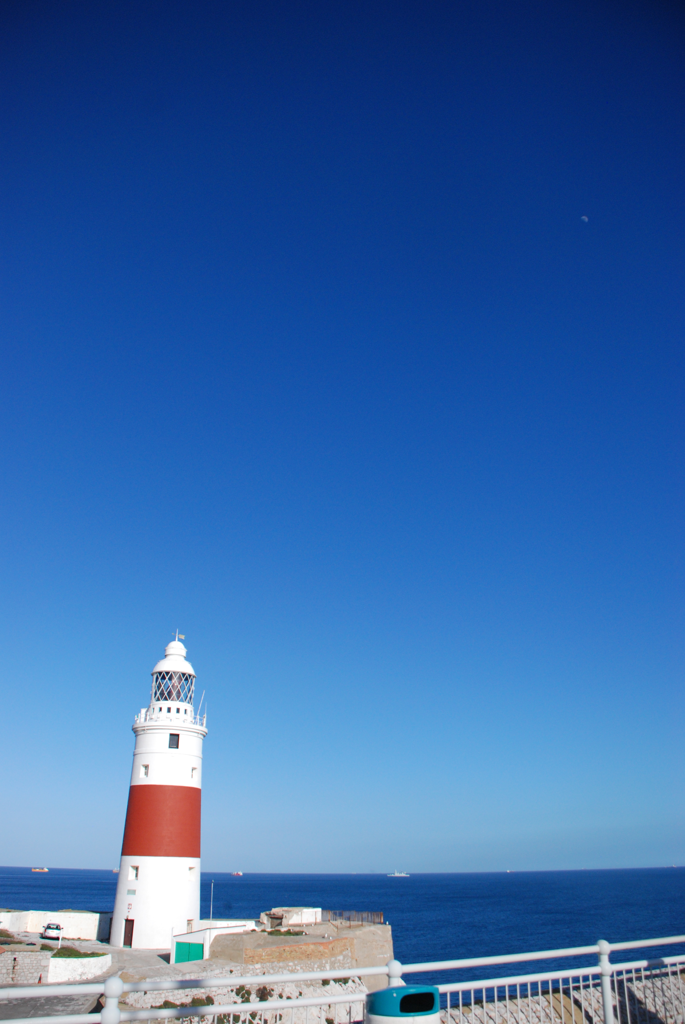 The lighthouse at Punta Europa, with a barely visible day moon in the top left corner