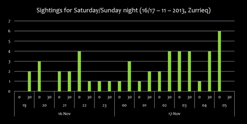 These are the sightings as detected by the lunaves scanner for Saturday (every 30 mins):